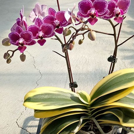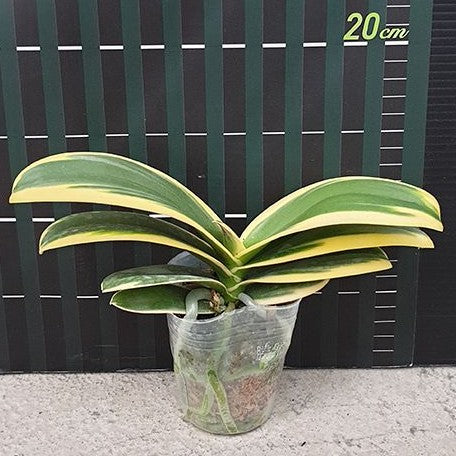Phalaenopsis Chia E Yenlin is a variegated variety of Phalaenopsis orchid, known for its unique leaf patterns.